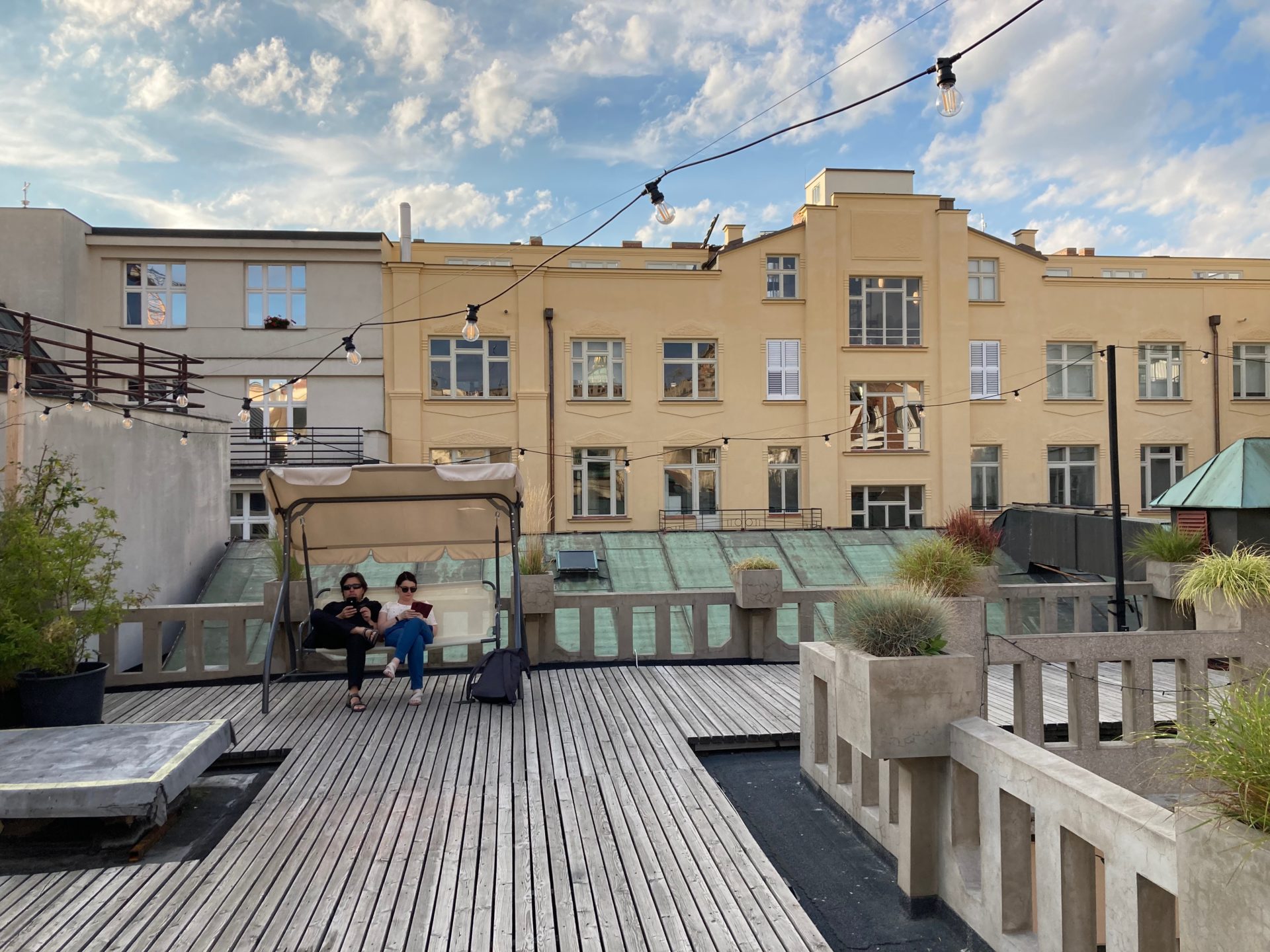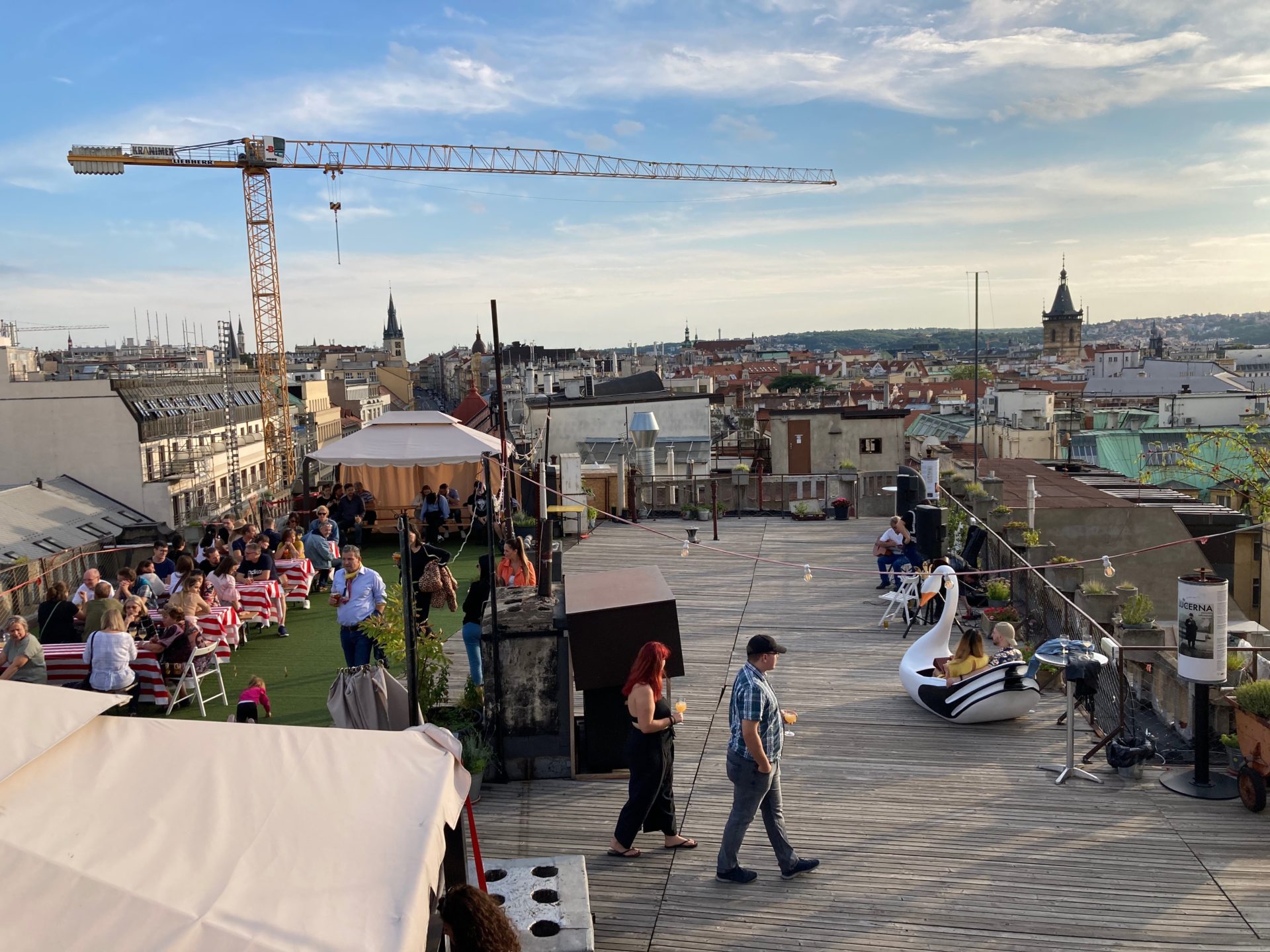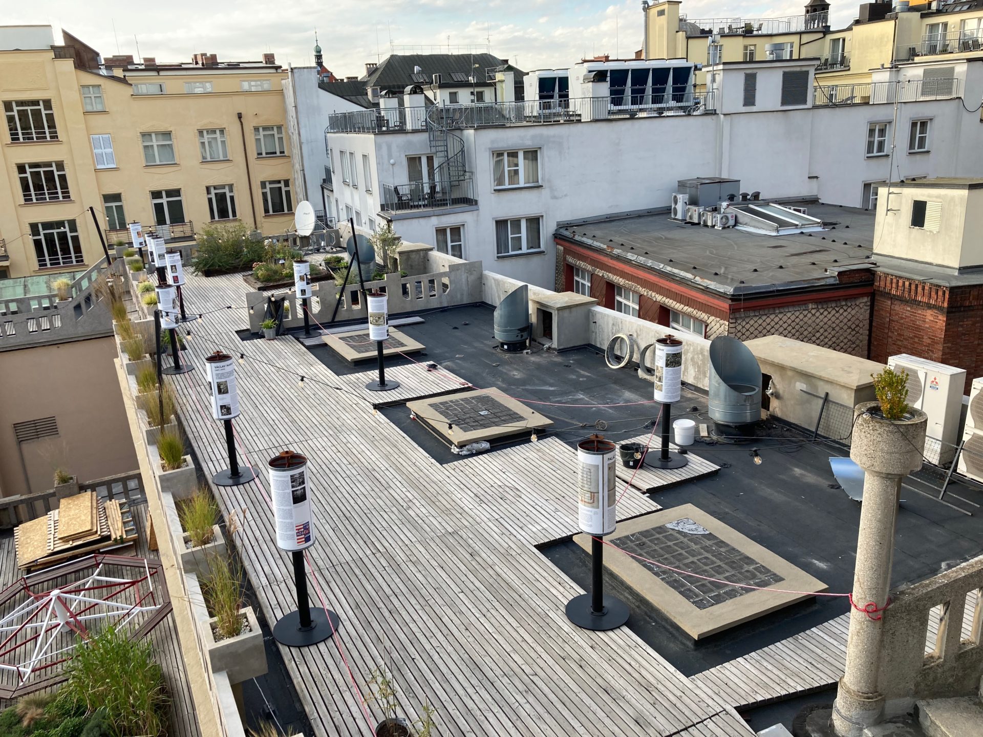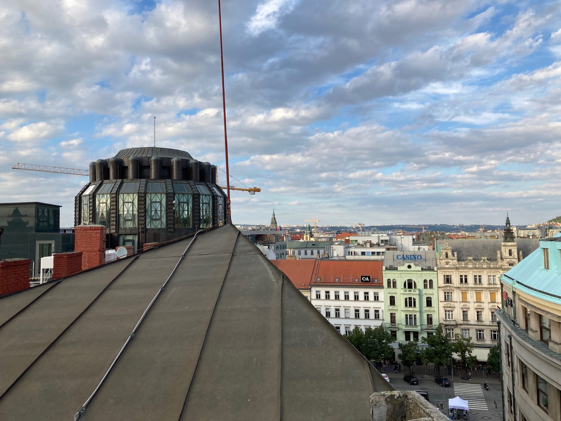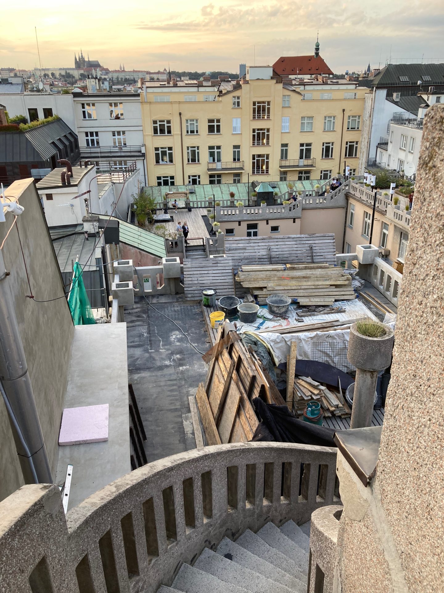 Ondřej Kobza rented the roof of Lucerna from the Havel family. He carried out basic repairs to the roof terraces and covered an area of 1,000 square meters with larch planks – the terraces now resemble an ocean liner sailing in a sea of other Prague roofs.